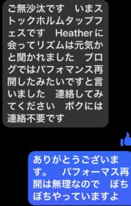 もし、彼がこれを「事務連絡」と考えてるんだったら、もしかしたら、彼は、海外のタップの有名人と僕の写真を、ものすごいたくさんの人に送りたくて、沢山送るのが忙しくて事務的になったのかもしれない。